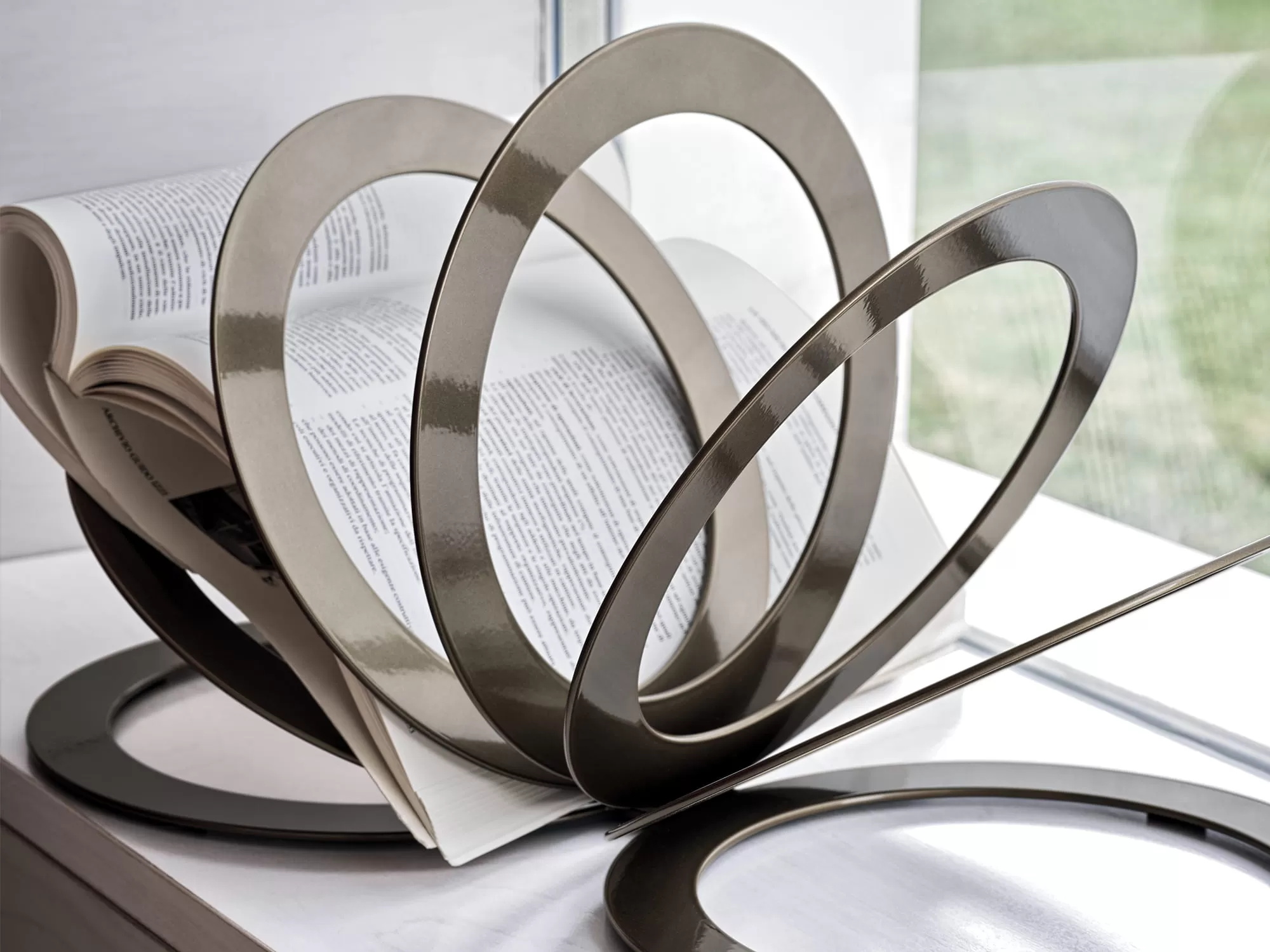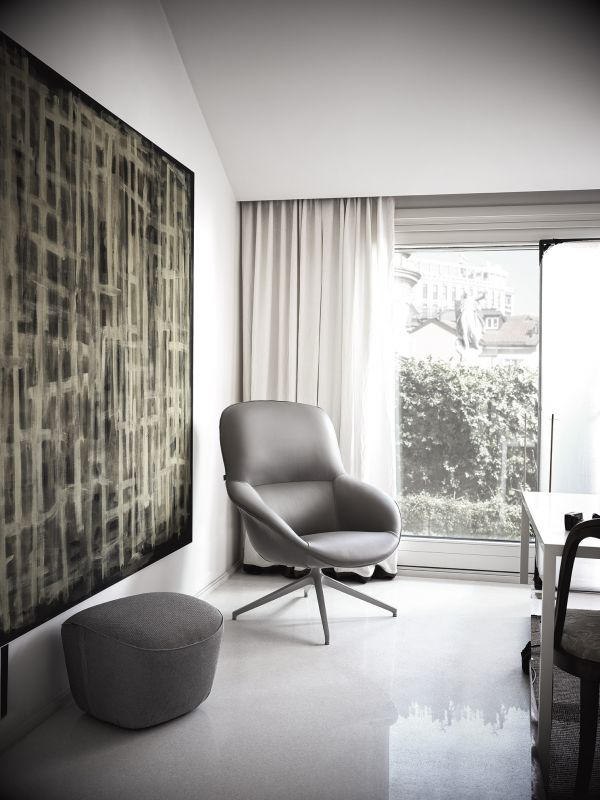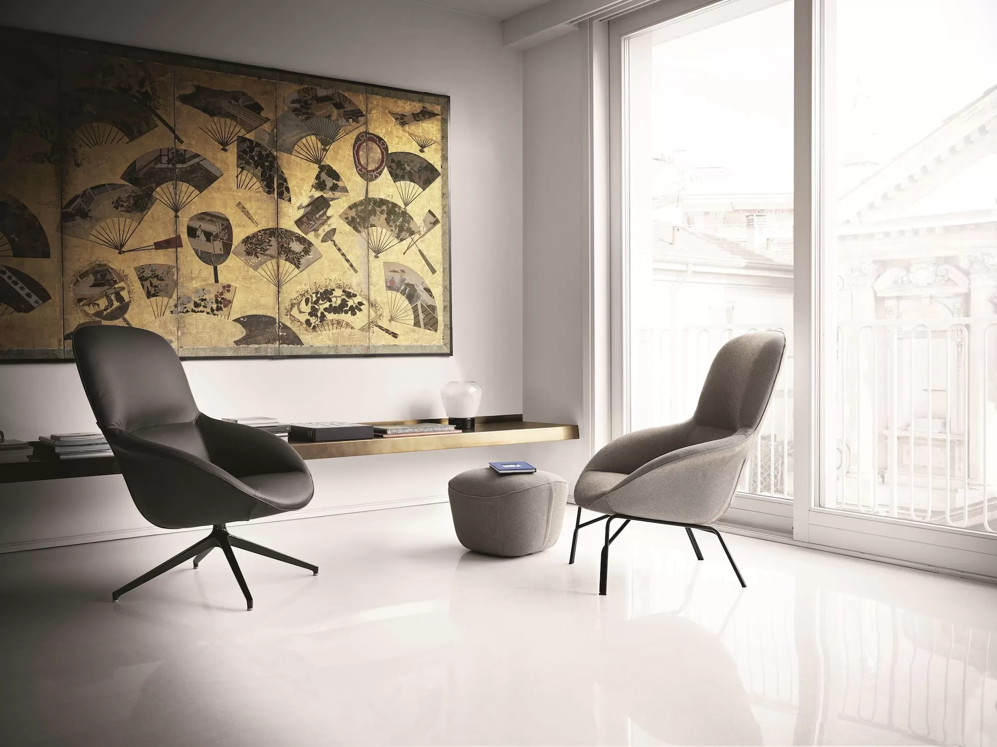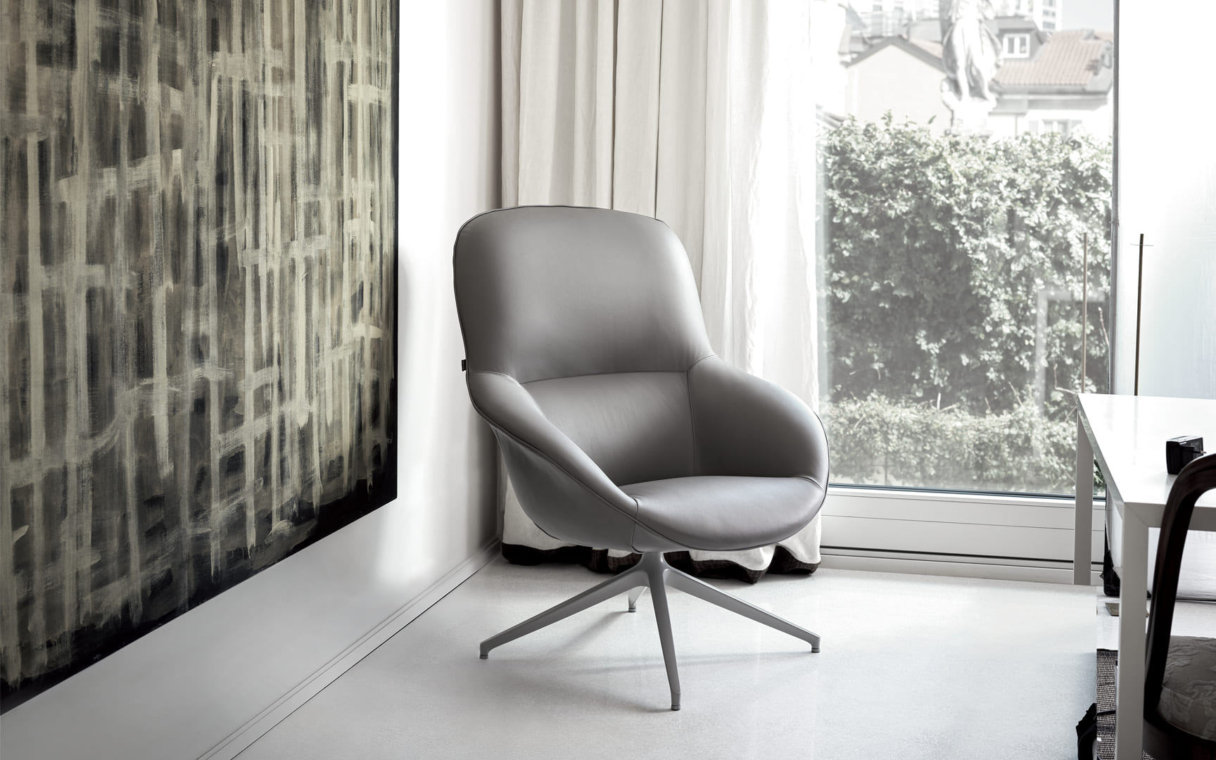 扶手椅带有铝制旋转中央腿,外壳带有金属嵌件,软垫为发泡聚氨酯,表面为环保皮革、技术丝绒、Mambo和Lulù面料、防水Nabuk、防水印花Nabuk、纯羊毛、丝绒、Decò面料、Kvadrat field和Kvadrat Coda面料、高级Nappa皮革。